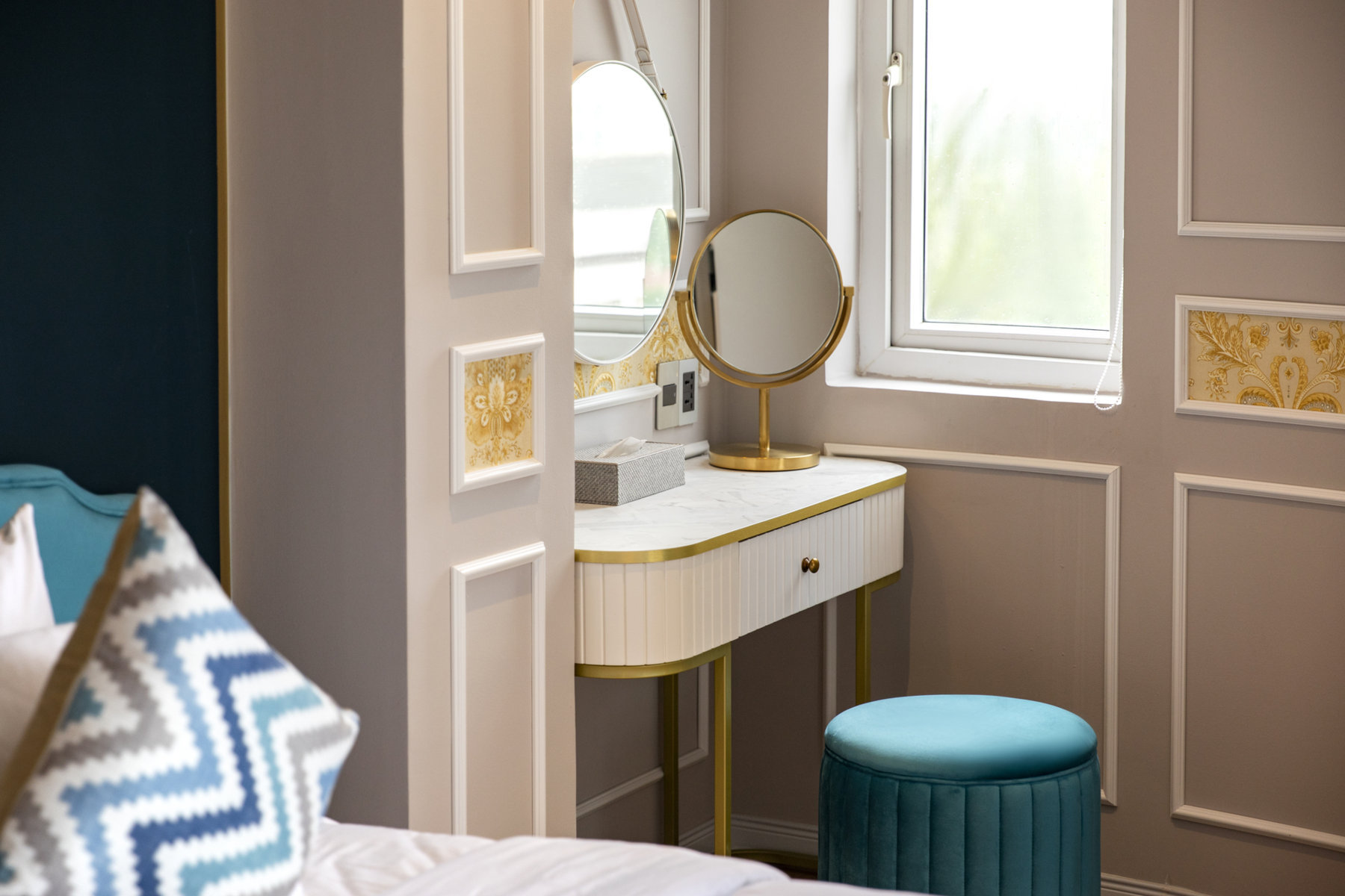 ✔ Well-appointed bedroom featuring tasteful artwork and 3D wallpaper